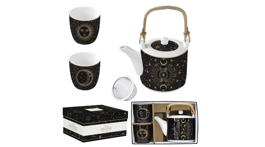 Porcelán teáskanna 600ml, fémszürővel, 2 porcelánpohárral 160ml, dobozban, Atmosphere, Celestial
