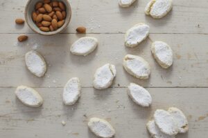 2. Ujjaiddal formálj belőlük rizsszem/rombusz alakú süteményeket (Ricciarelli-forma).