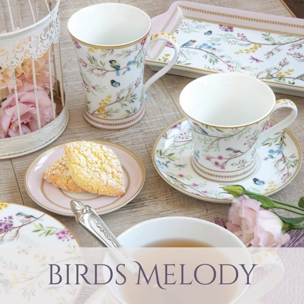 Lágy virágminták, finom pasztell árnyalatok és apró madárkák teszik igazán különlegessé ezt a porcelánt.