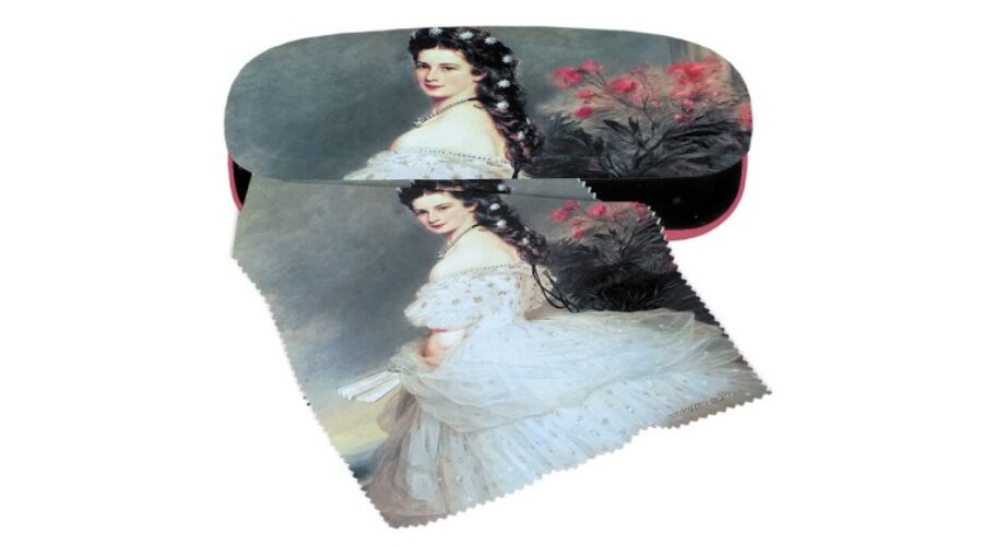 Textilbevonatú szemüvegtok Erzsébet királyné (Sisi) portréjával, törlőkendővel.