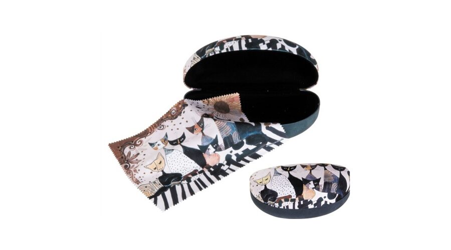 Művészi cicás mintás szemüvegtok puha textilbevonattal és törlőkendővel.