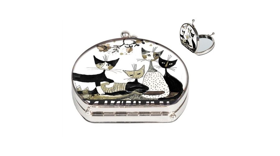 7×7,5×2,5 cm-es nagyítós zsebtükör Rosina Wachtmeister Cats Sepia macskás mintájával, textilbevonattal.