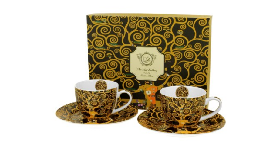 Művészi porceláncsésze és alj szett Gustav Klimt Életfa motívumával, 2 személy részére, elegáns dobozban.