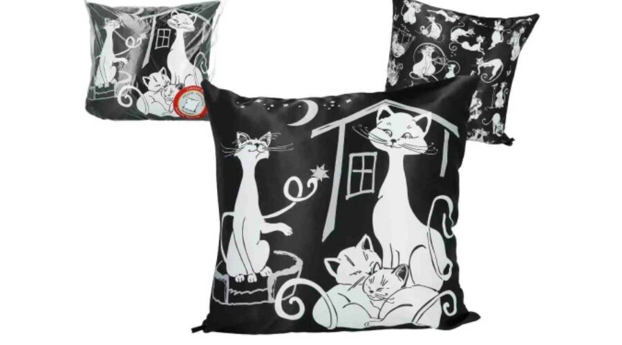 Párna 45x45cm, polyester, fekete alapon fehér macskás