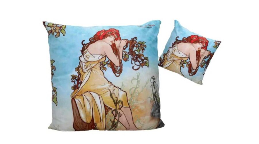 Művészi párna Mucha: Nyár motívummal, 50×50 cm, poliészter huzattal.