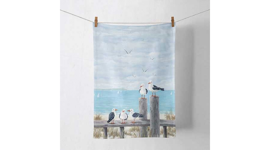 Sirályok a dokkon mintás pamut konyharuha 50×70 cm-es méretben. Tengerparti hangulatú, vintage stílusú konyhai kiegészítő.