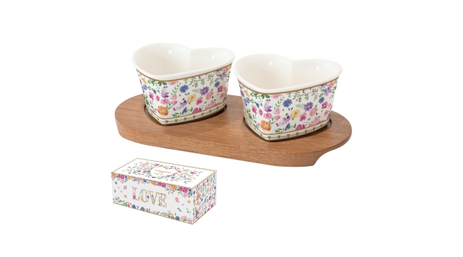 Porcelán szívtálka 2 db, akácfatálcán 21x10cm, dobozban, Mon Amour