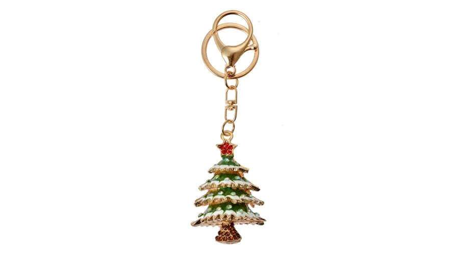 Fém kulcstartó karácsonyfás, üveggyönggyel, 4x2x7cm