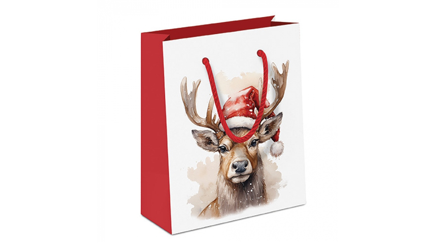 Papír ajándéktáska Deer with Santa hat white, 22x13x25cm