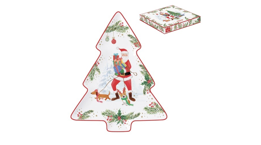 Porcelán fenyőtálca 20,5×25,5cm, dobozban, Joyful Santa