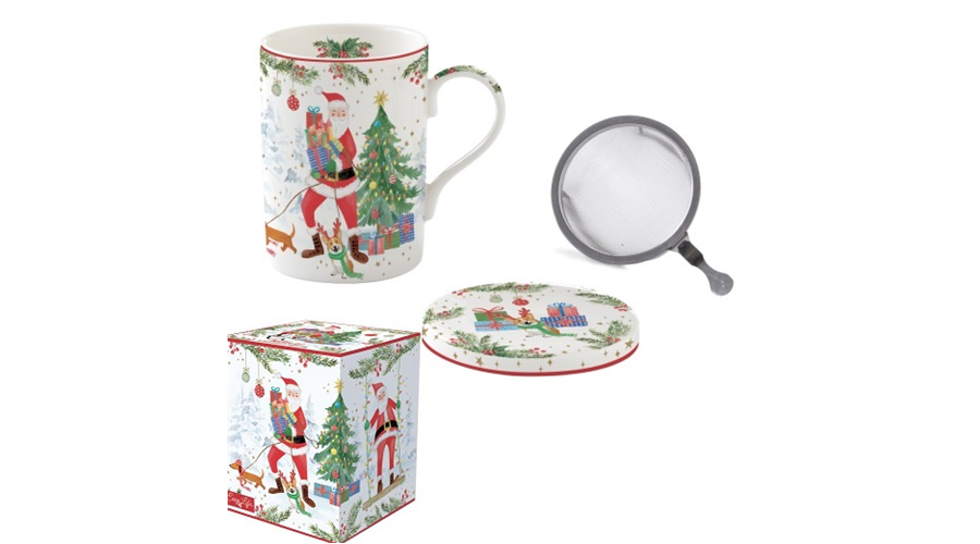 Porcelán szűrősbögre tetővel, 350ml, dobozban, Joyful Santa
