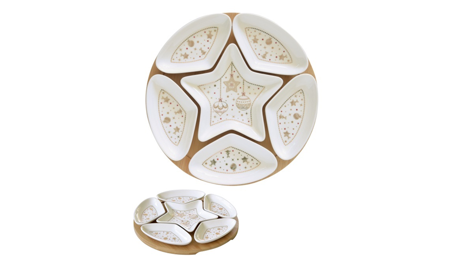 Porcelántálka 6db-os szett kerek bambusztálcán 25cm,dobozban, Christmas Lights