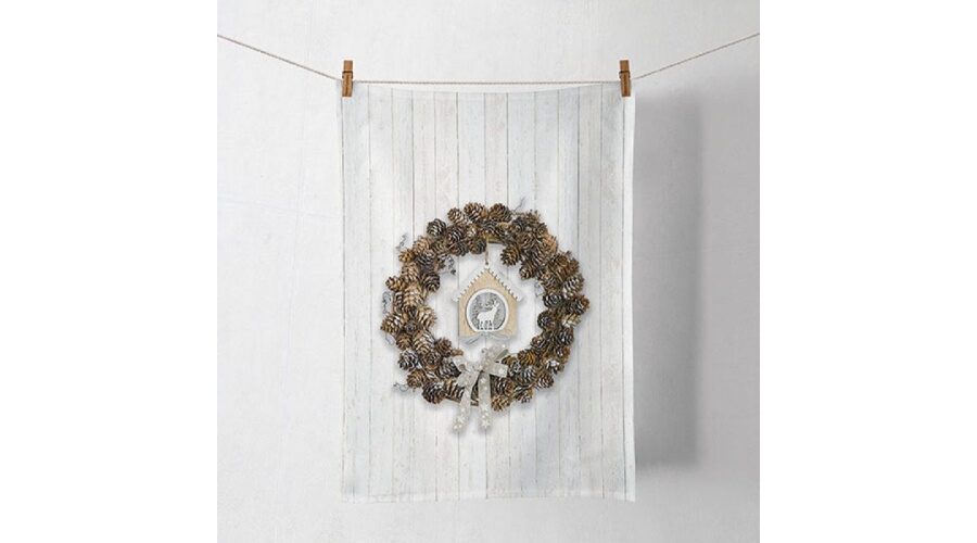 • Szürke és barna színű, fenyőtoboz koszorú mintás pamut konyharuha, 50×70 cm-es méretben. Rusztikus és vintage stílusban, karácsonyra.