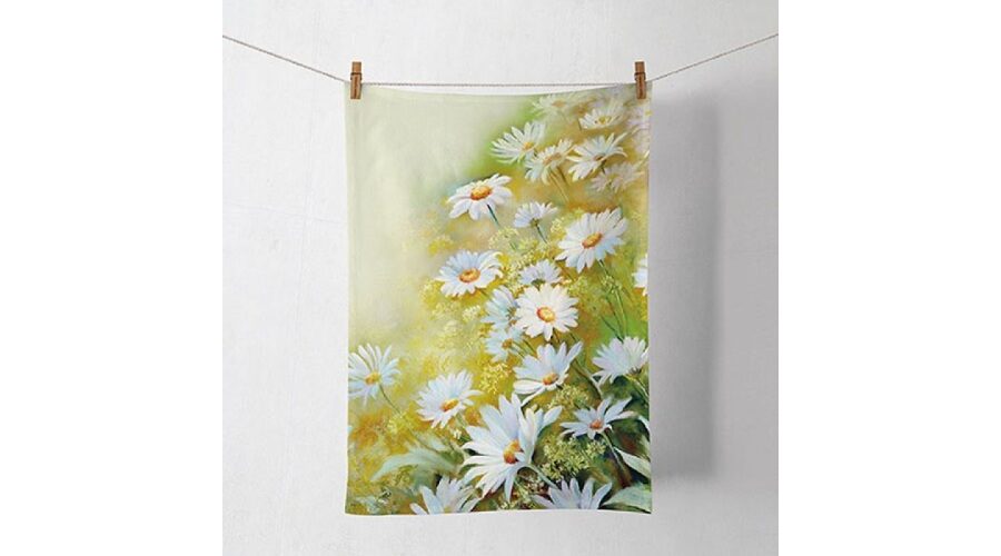 • Fehér és sárga napraforgó mintás pamut konyharuha 50×70 cm-es méretben. Rusztikus, vintage stílusú.