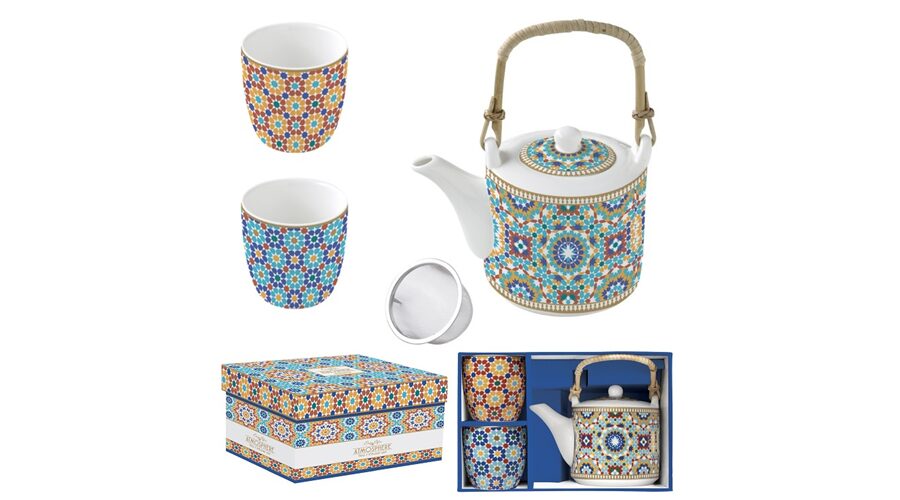 Porcelán teáskanna 600ml, fémszűrővel, 2 porcelánpohárral 160ml, dobozban, Marrakech, Atmosphere