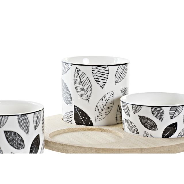 Stílusos és modern, ez a porcelán és bambusz előétel kínáló szett fekete és fehér színkombinációban. Három darab kínálótálka egy bambusz tálcán, 20×8 cm méretben ideális választás kisebb falatok és snackek elegáns tálalására.