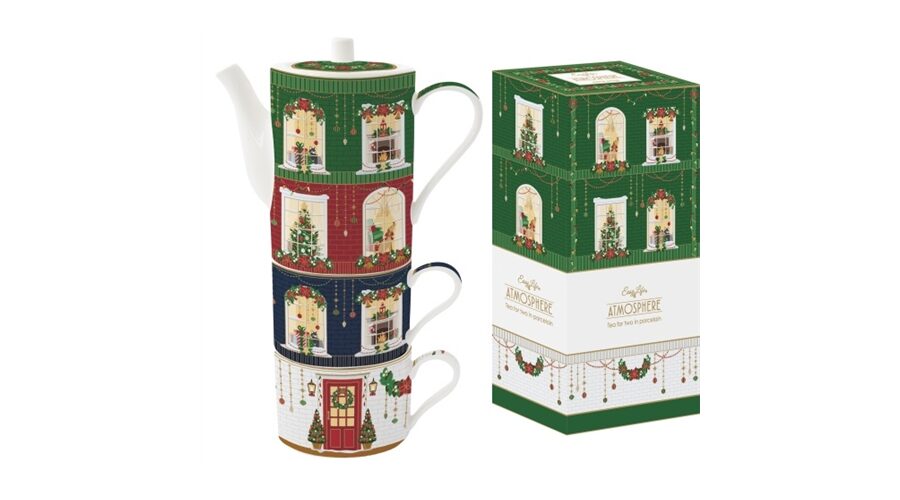 Porcelán bögreszett 2 db, 240ml, teáskannával 500ml, egymásba sorolós, dobozban, Festive Avenue, Atmosphere