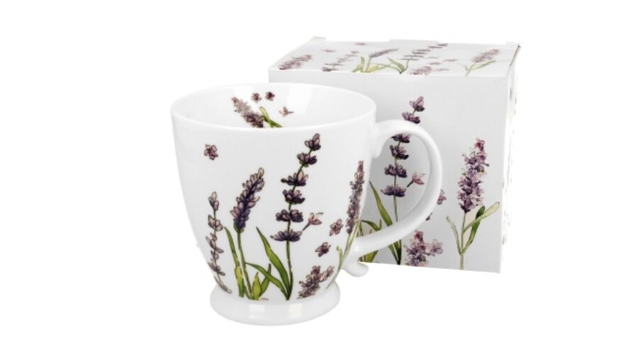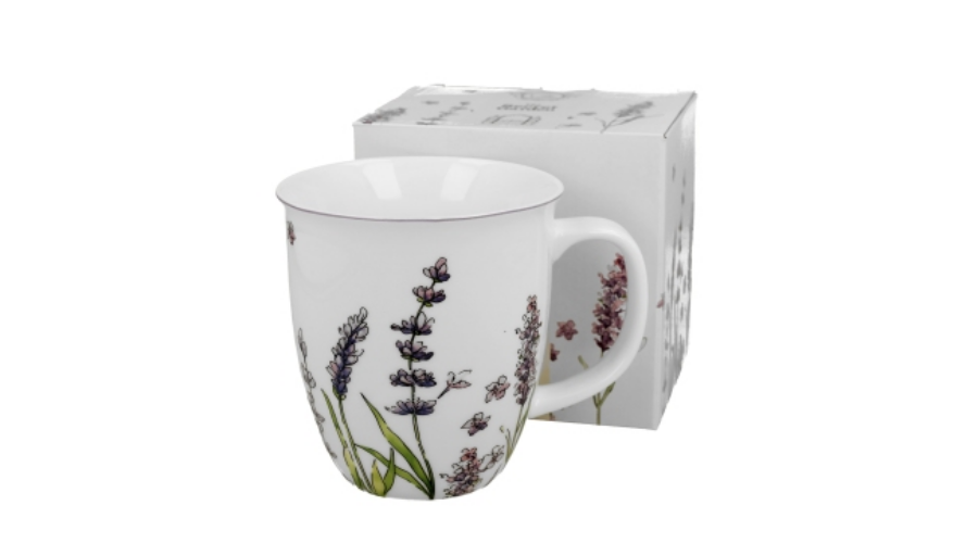 380 ml-es porcelánbögre levendula mintával, rusztikus stílusban, díszdobozban.