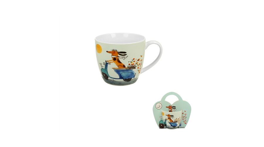 460 ml-es porcelánbögre robogón utazó kutyával, díszcsomagolásban.