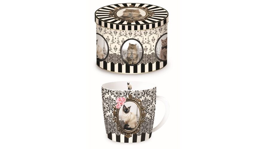 Porcelánbögre fémdobozban 250ml, Barokk, cica