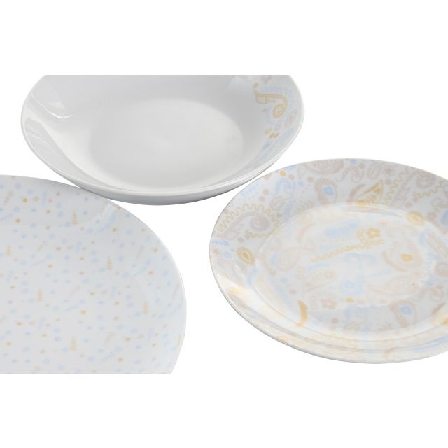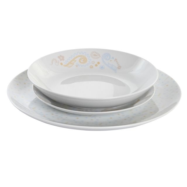 Ez a halvány decens mintázatú porcelán étkészlet, színes kivitelben, 18 darabos szettben kapható, a lapos nagytányér átmérője 27cm. Ideális választás azok számára, akik egyedi és visszafogottabb tálalási megoldást keresnek otthoni alkalmakra.
